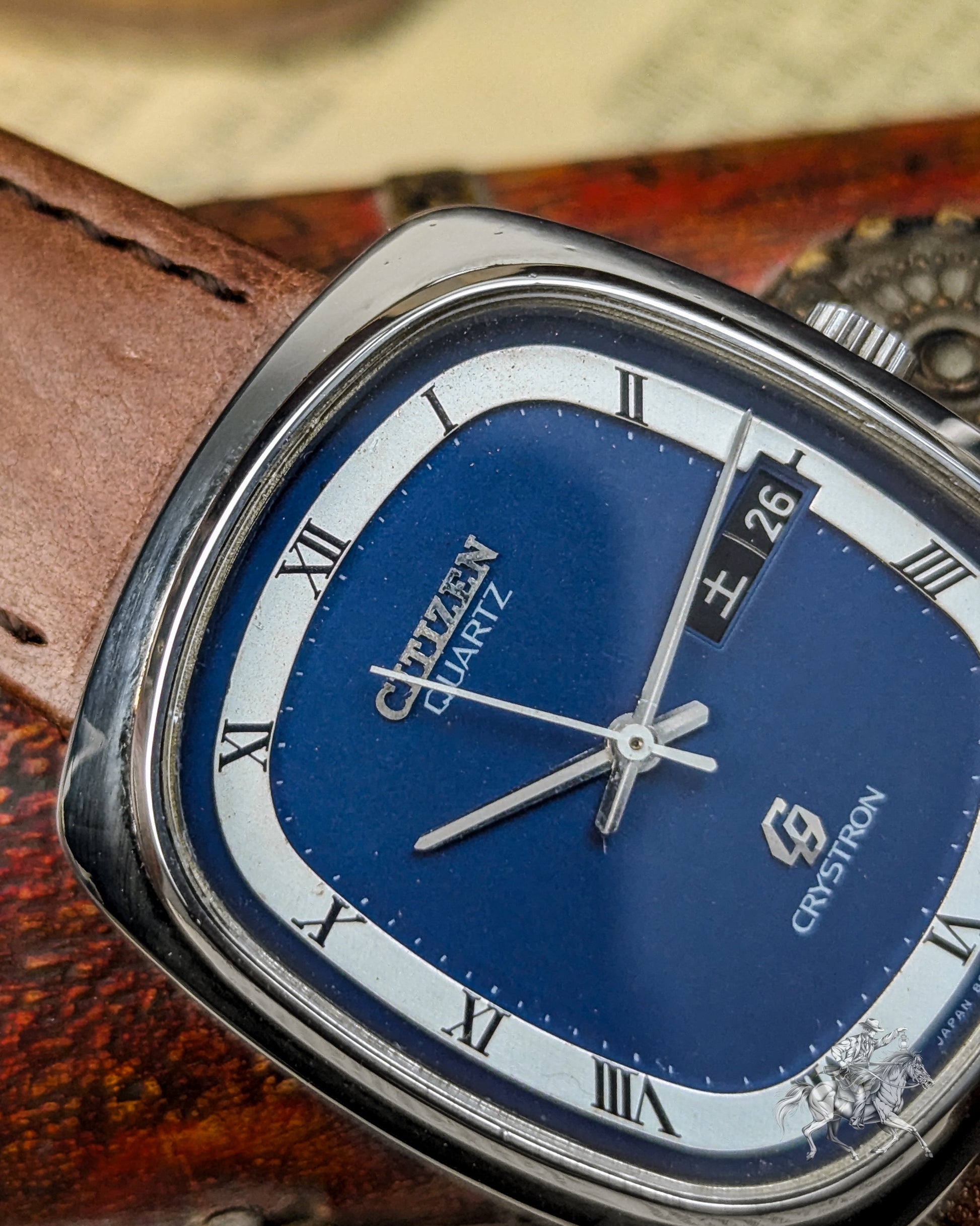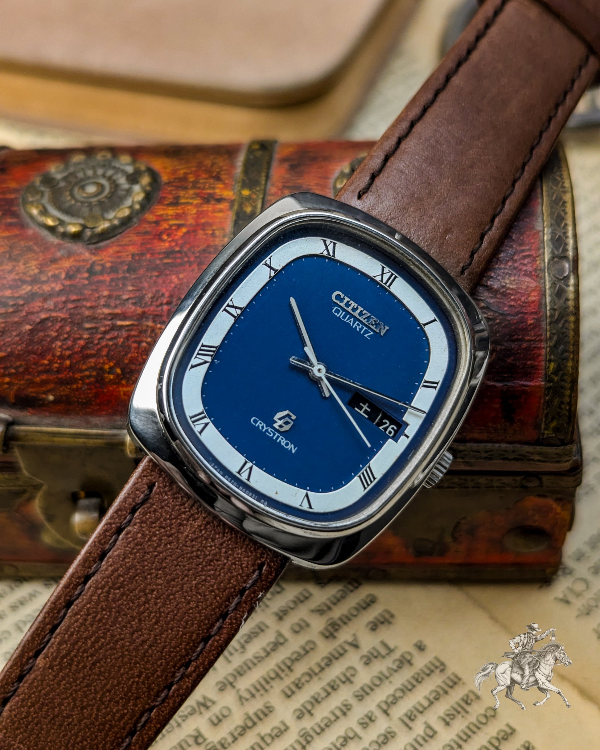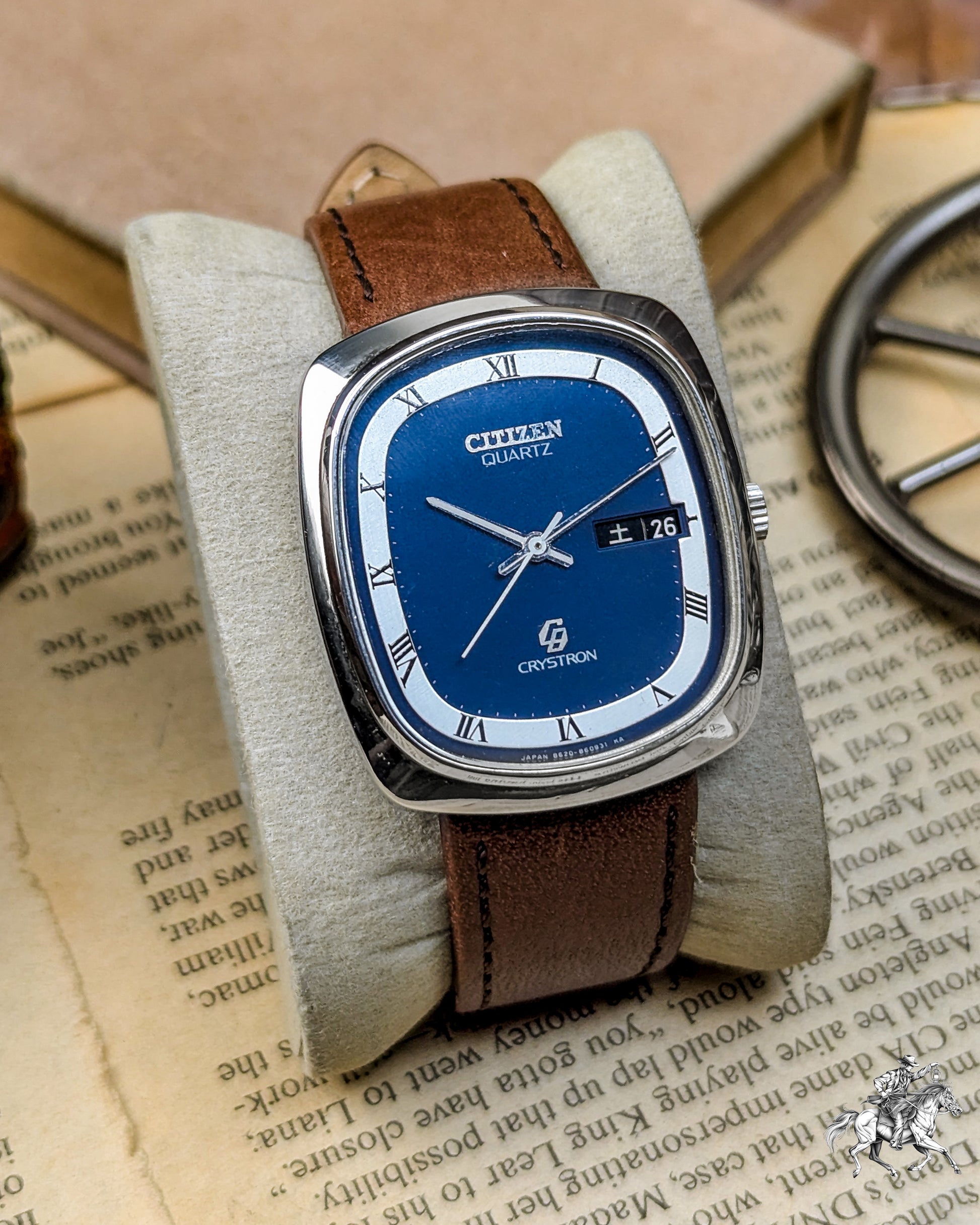 This timepiece is a significant artifact from the era when quartz technology was brand new and highly prestigious! The Citizen Crystron line was Citizen's premier quartz offering in the 1970s and 1980s, designed to showcase the ultimate in timekeeping accuracy. The watch is likely powered by the robust Citizen Caliber 8620 (a later, high-quality revision of the 8600 series), which provides excellent grab-and-go accuracy with exceptional reliability. The deep Navy Blue Dial is highly stylish, framed by prominent white Roman numerals and a unique television-shaped case that perfectly captures the bold aesthetic of the mid-1970s. The movement's inherent efficiency allows the case to remain slim and discreet, despite its bold profile. This is an excellent acquisition for a collector who appreciates pioneering quartz technology and the distinctive design of Citizen's vintage JDM line.