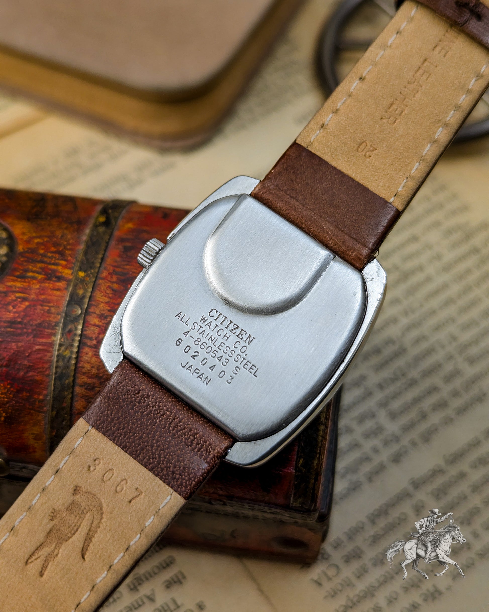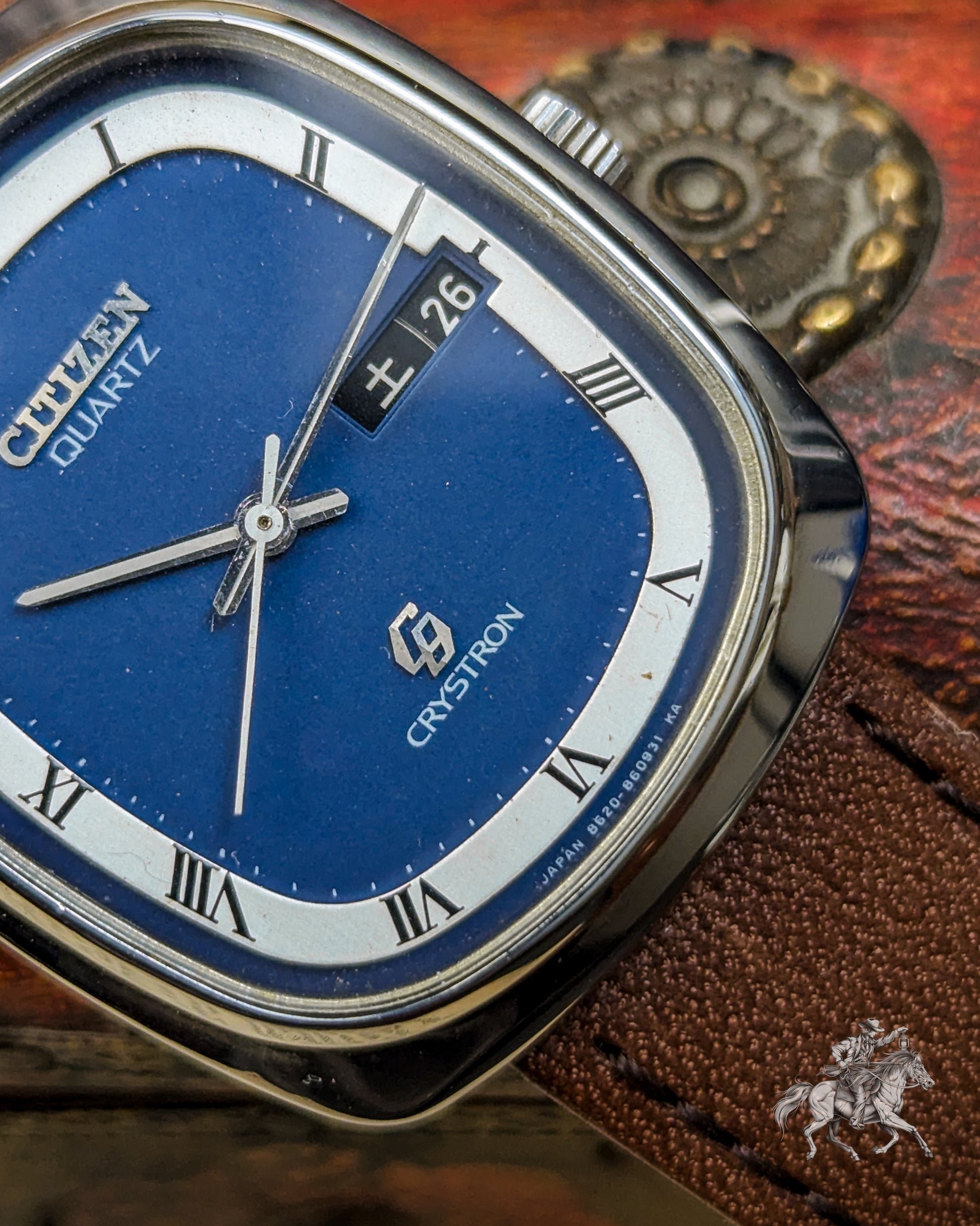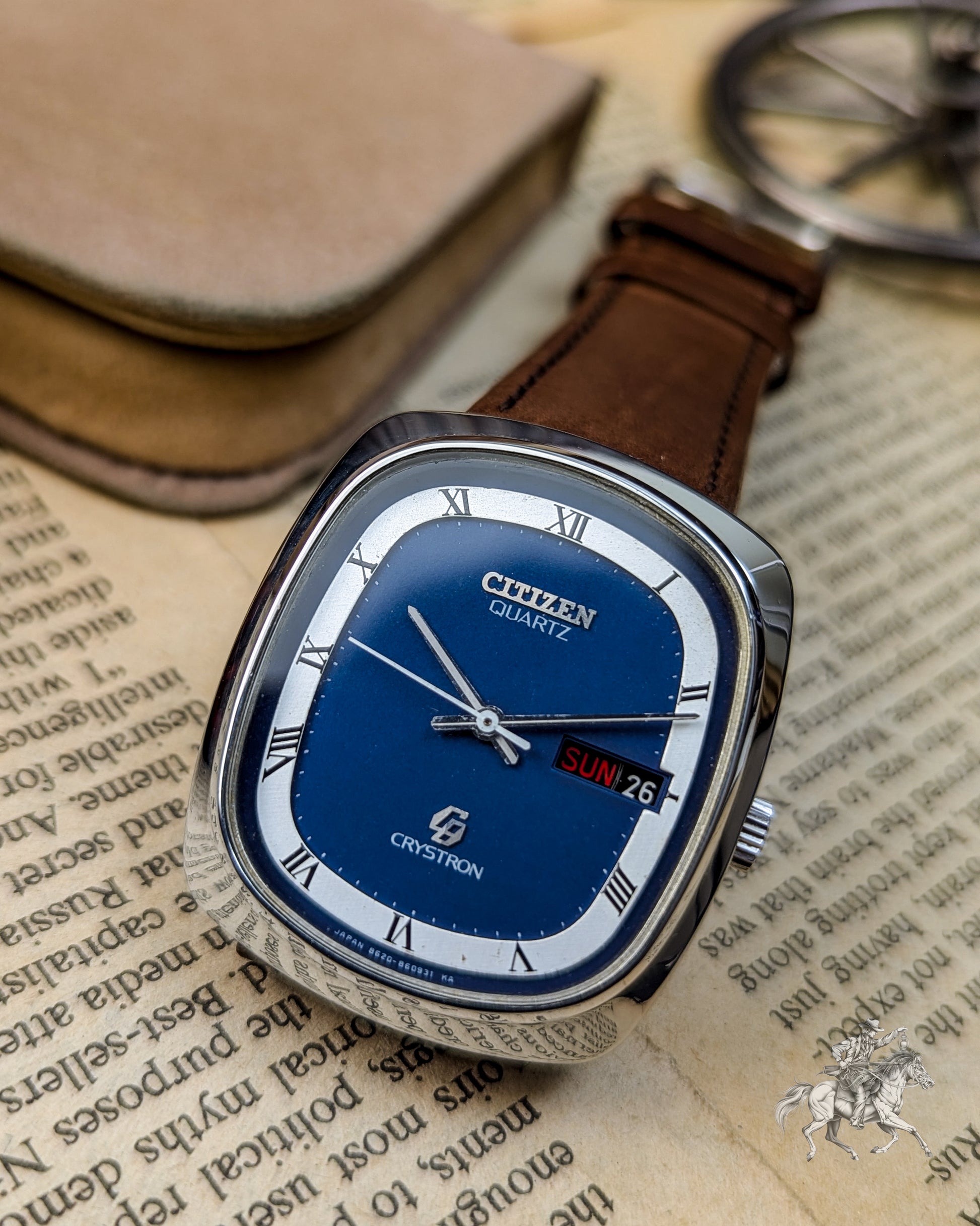 This timepiece is a significant artifact from the era when quartz technology was brand new and highly prestigious! The Citizen Crystron line was Citizen's premier quartz offering in the 1970s and 1980s, designed to showcase the ultimate in timekeeping accuracy. The watch is likely powered by the robust Citizen Caliber 8620 (a later, high-quality revision of the 8600 series), which provides excellent grab-and-go accuracy with exceptional reliability. The deep Navy Blue Dial is highly stylish, framed by prominent white Roman numerals and a unique television-shaped case that perfectly captures the bold aesthetic of the mid-1970s. The movement's inherent efficiency allows the case to remain slim and discreet, despite its bold profile. This is an excellent acquisition for a collector who appreciates pioneering quartz technology and the distinctive design of Citizen's vintage JDM line.