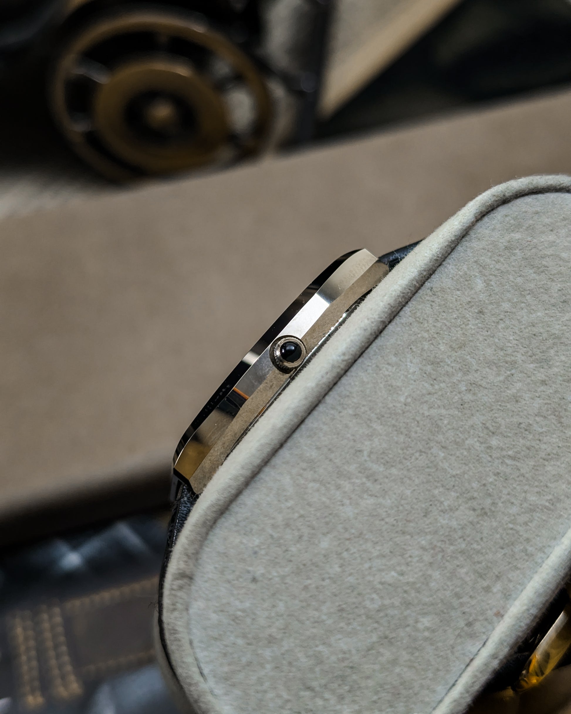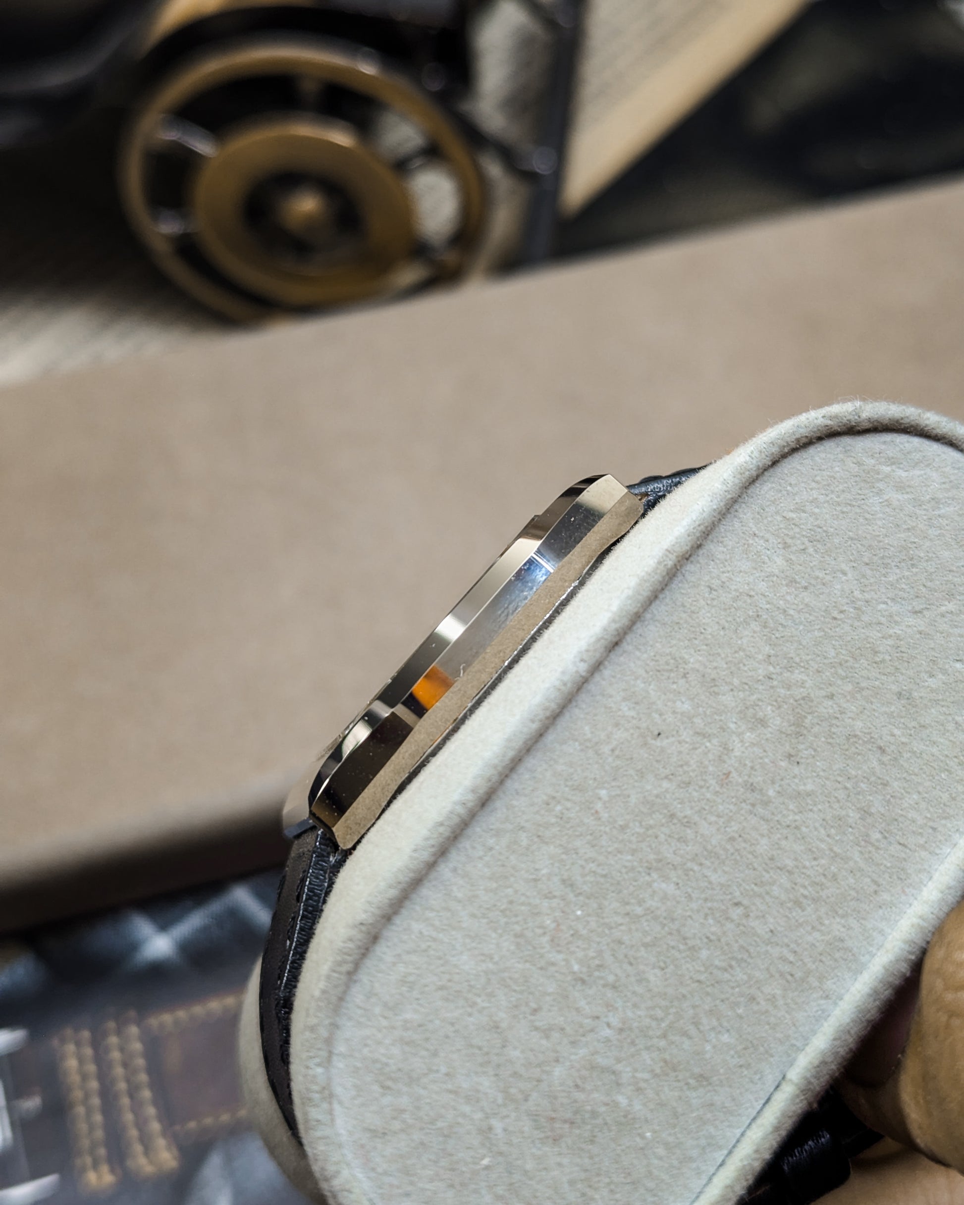 The design is pure, sophisticated geometry. The watch utilizes a sleek, octagonal gold-plated case which frames a handsome black sunburst dial. The dial uses clean, minimalist gold-toned baton indices and a simple date display- achieving a refined- uncluttered aesthetic that emphasizes the watch's premium intent. The compact quartz movement allows the case to be exceptionally slim and discreet on the wrist.