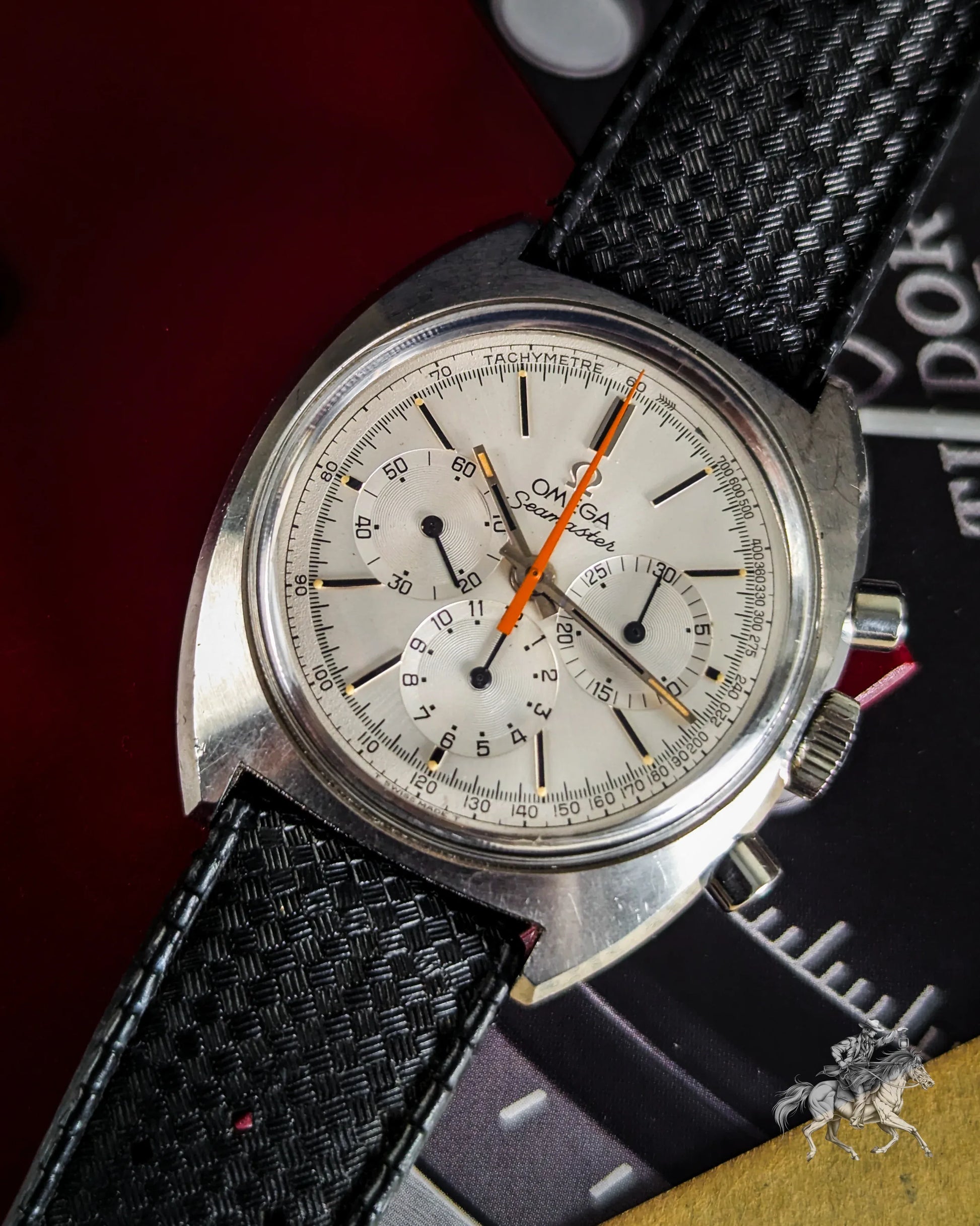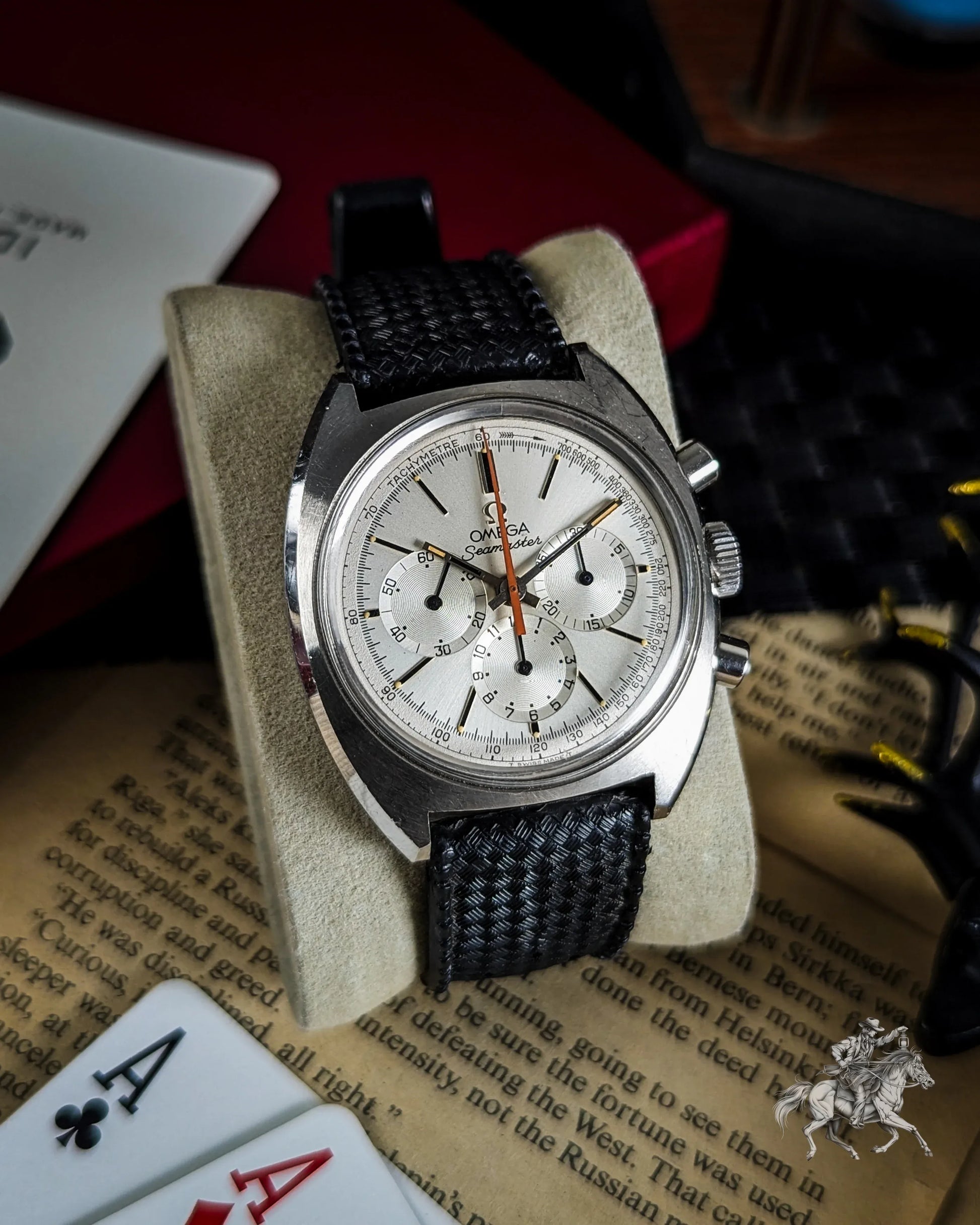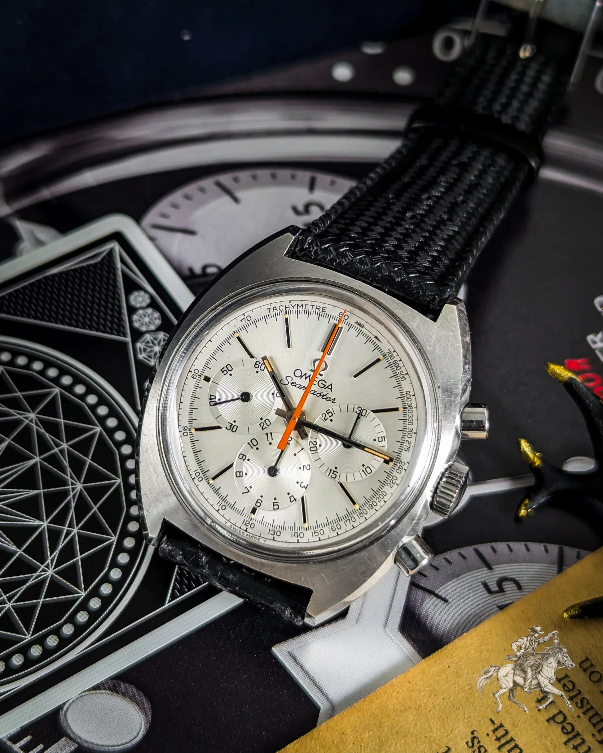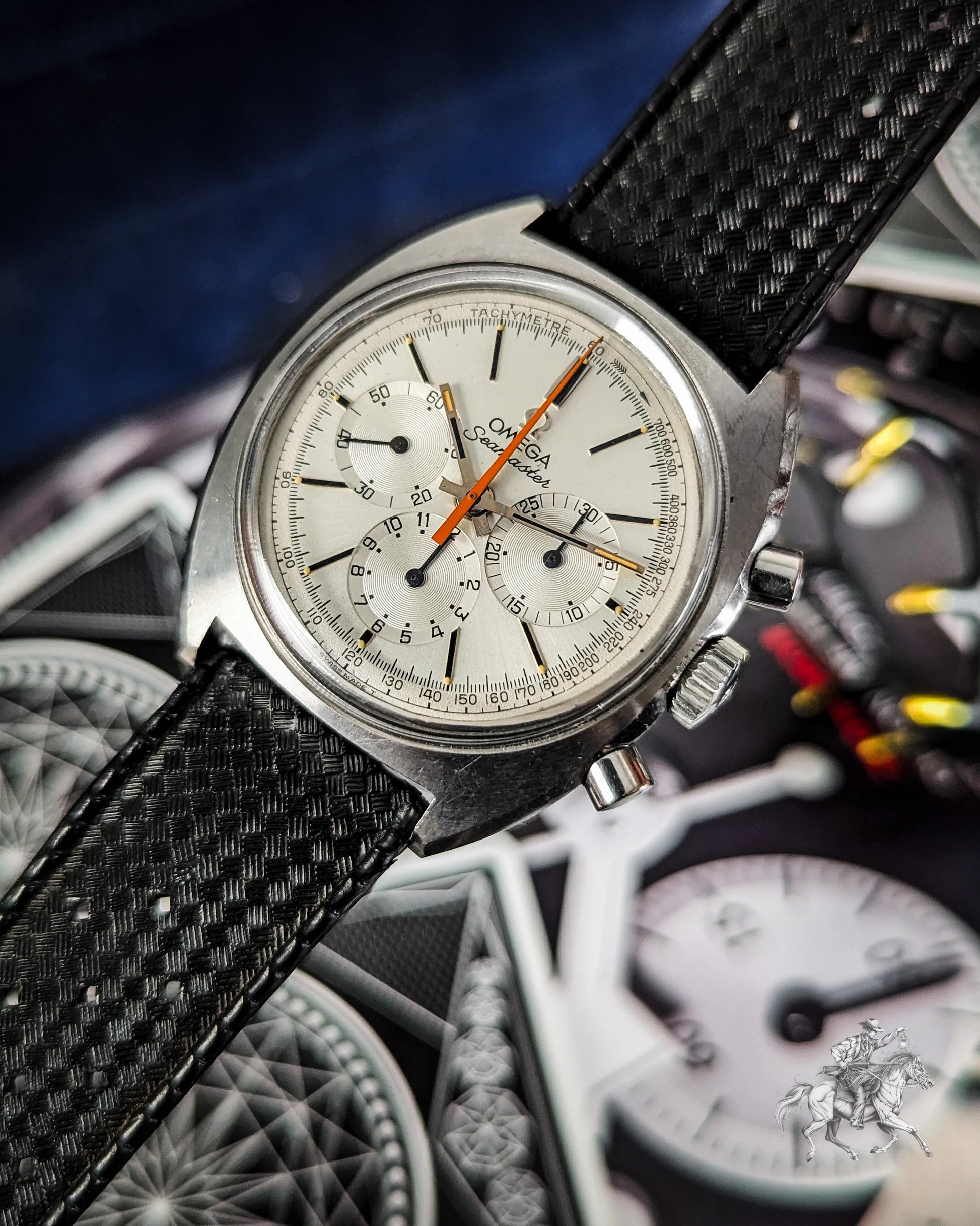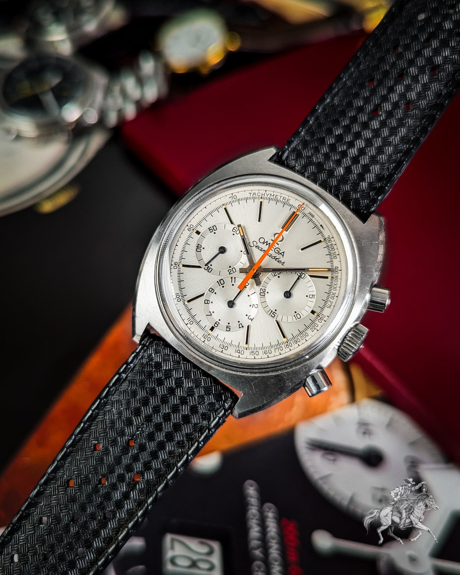 This example features white radial sub-dials, a matching white matte tachymetre scale, and a red central chronograph seconds hand, a striking detail also seen on the Omega Chronostop and the iconic 1967 Speedmaster “Ultraman”. These subtle but rare design cues give this piece a unique and highly sought-after aesthetic.
