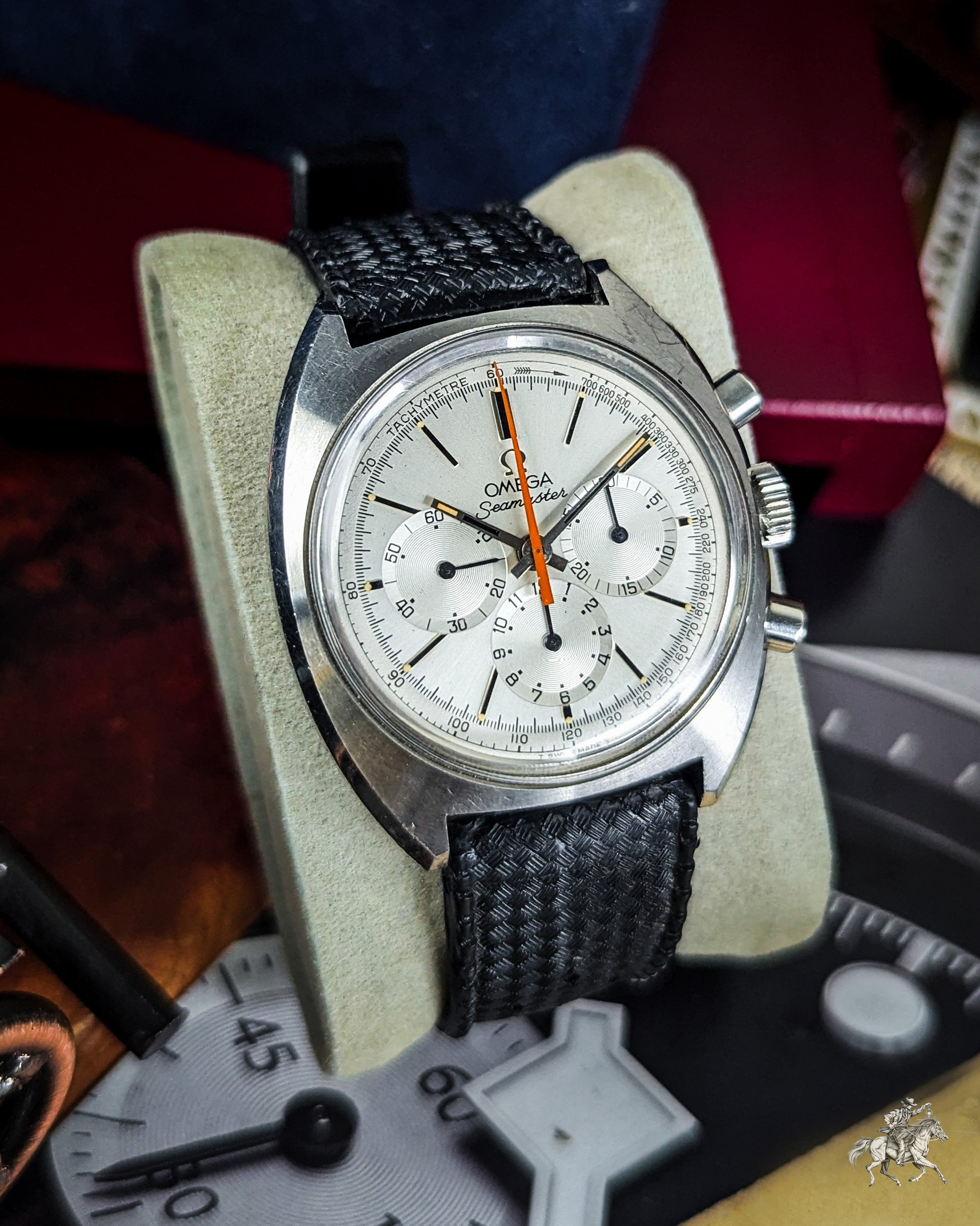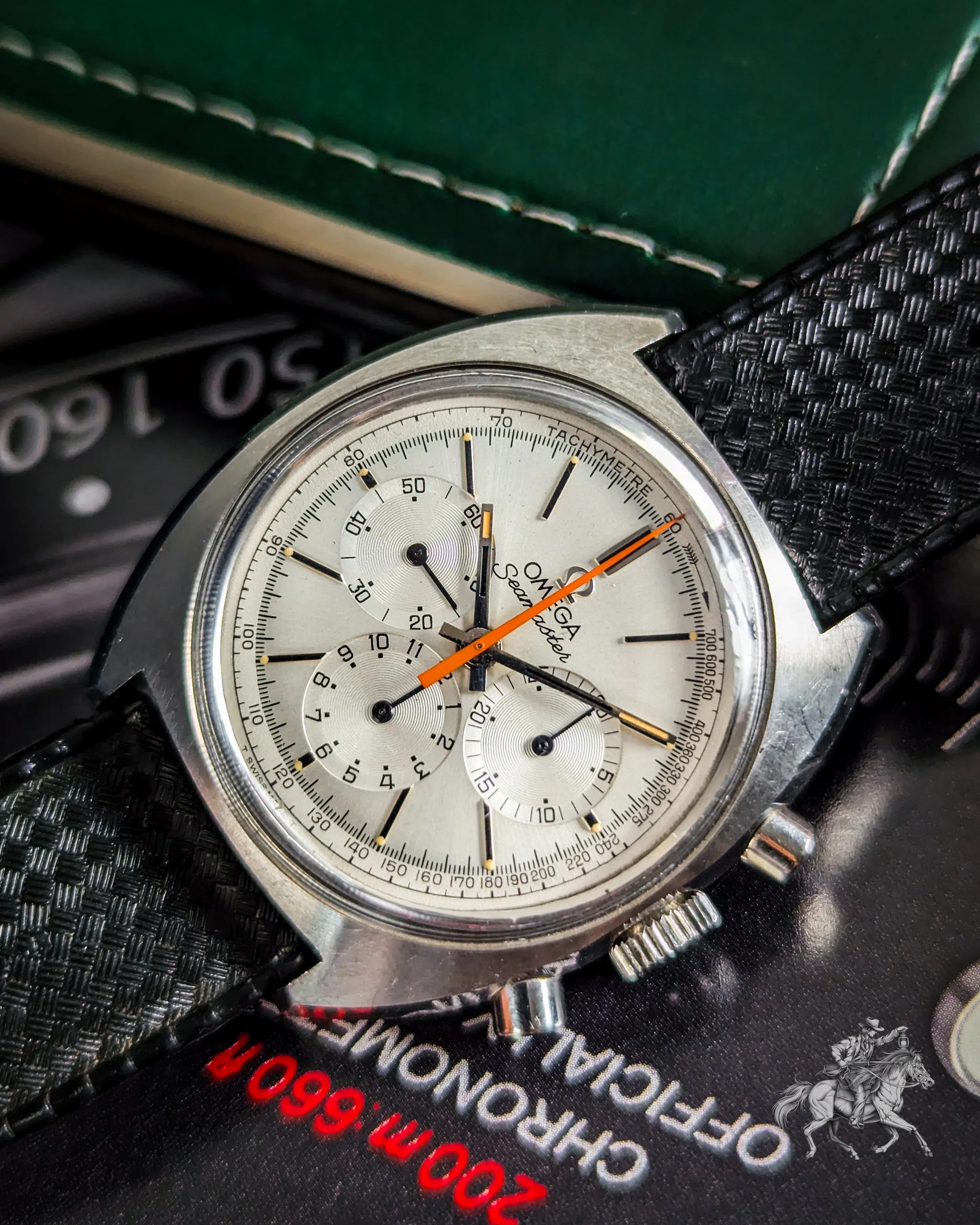 This beautiful Omega Seamaster Chronograph Ref. 145.006-66 is a seldom-seen variant from the mid-1960s, distinguished by its rare “albino” white dial configuration.
