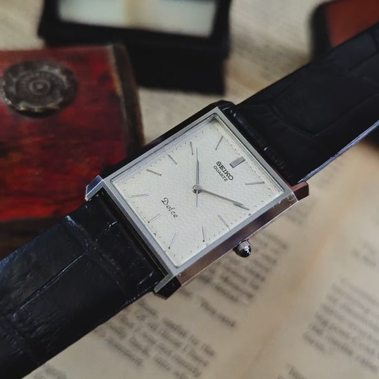 This is an exceptionally elegant Seiko Dolce Tank 9521-5160, a true gem from Seiko's high-end collection of the 1980s. Released around 1984, this timepiece embodies classic style and sophistication, making it a standout dress watch.